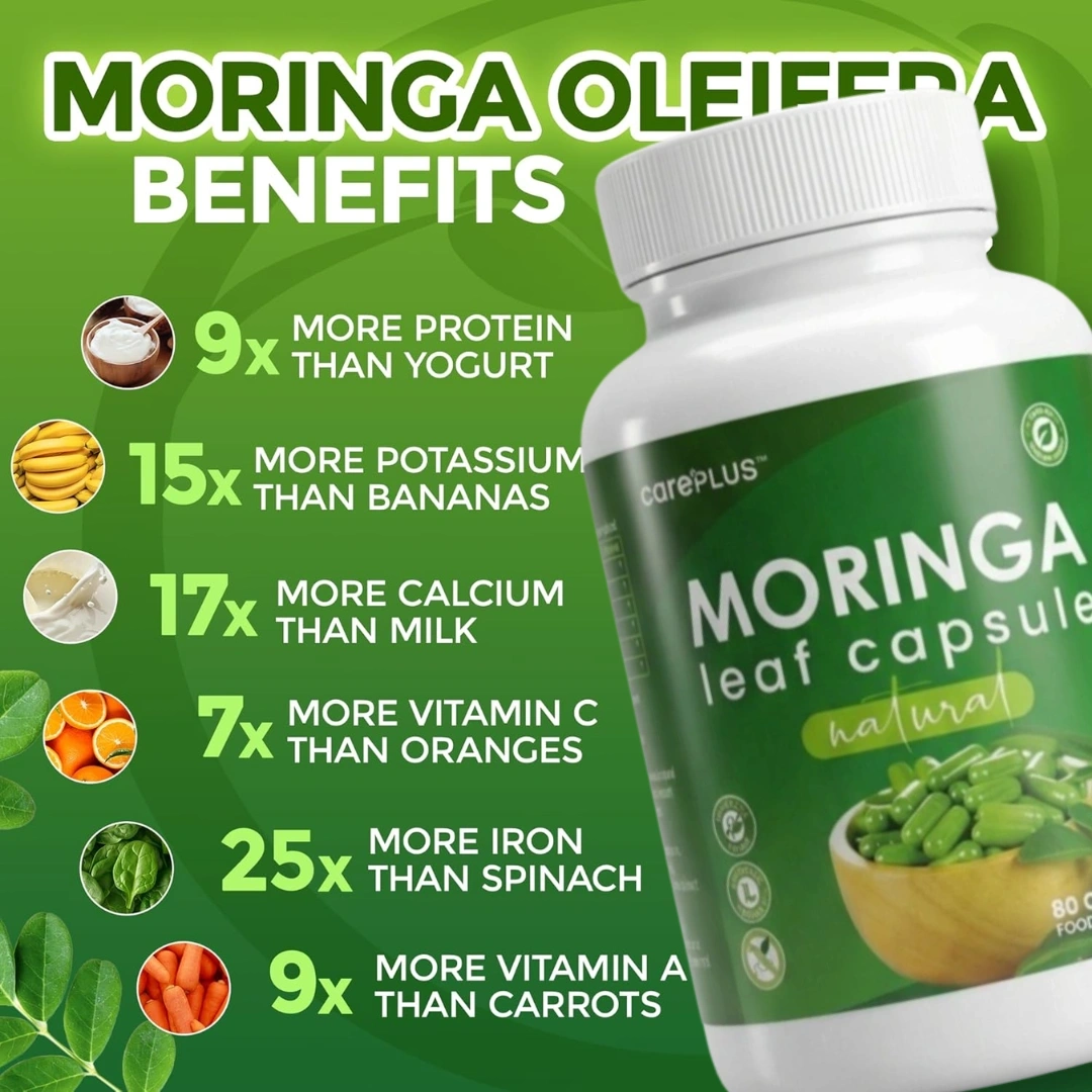 CarePlus Moringa Capsule (80pcs) is a natural herbal supplement made from high-quality moringa leaves, known as the βMiracle Treeβ. It is packed with essential nutrients like vitamins A, C, E, calcium, iron, and powerful antioxidants.